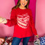 Unwind in style with our Kiss Cake Red Pullover. Made with ultra cozy fabric, it's like wearing a pajama. Adorned with a beautiful ink / GLITTER texture elements graphic, this top adds a touch of style to your loungewear. Features side slits and a longer back for easy styling. A must-have for the cooler seasons.